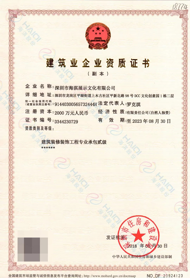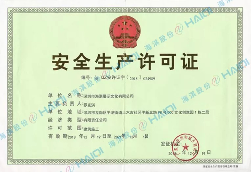 近日,深圳市海淇展示文化有限公司(以下簡稱海淇)繼取得由住房和城鄉(xiāng)建設部頒發(fā)的建筑裝修裝飾工程專業(yè)承包二級資格證書之后,再次順利獲得了安全生產(chǎn)許可證書。這一證書的取得,標志著海淇資質(zhì)證照申領工作取得了階段性成果,同時也為海淇立足于裝飾裝修行業(yè)提供了又一重要通行證。