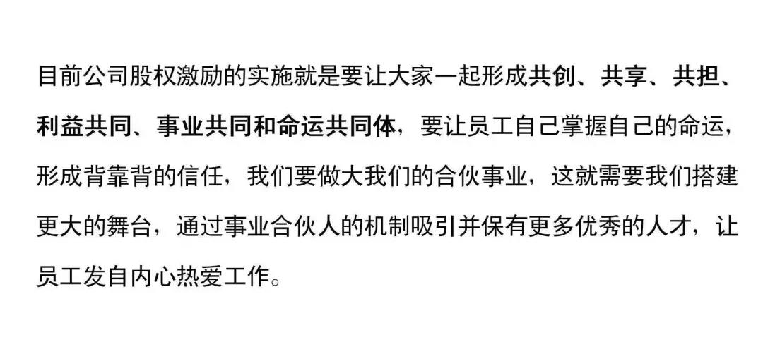 華為任正非提出:“力出一孔,利出一孔”。他認(rèn)為這是華為成功的關(guān)鍵,所謂“力出一孔”即業(yè)務(wù)聚焦,華為堅(jiān)持聚焦主航道不動(dòng)搖。而“利出一孔”,實(shí)際上就是任正非在創(chuàng)辦華為時(shí)就建立起來(lái)的,與員工分享公司利潤(rùn)成果的分享機(jī)制。任總認(rèn)為這是華為成功的最核心要素。