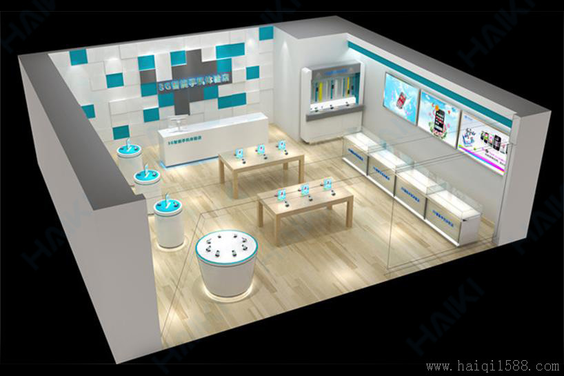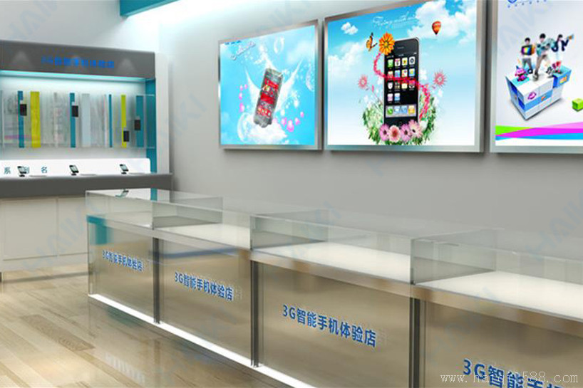 3G智能手機整店展示設(shè)計;將陳設(shè)藝術(shù)、生活功能等多種復(fù)雜元素的創(chuàng)造性融合,每一個區(qū)域、每一種物品都是整體環(huán)境的組成部分,柜臺與整體店面裝潢風格保持一致,燈箱的精美畫面在空間陳設(shè)中發(fā)揮著不可替代的作用。